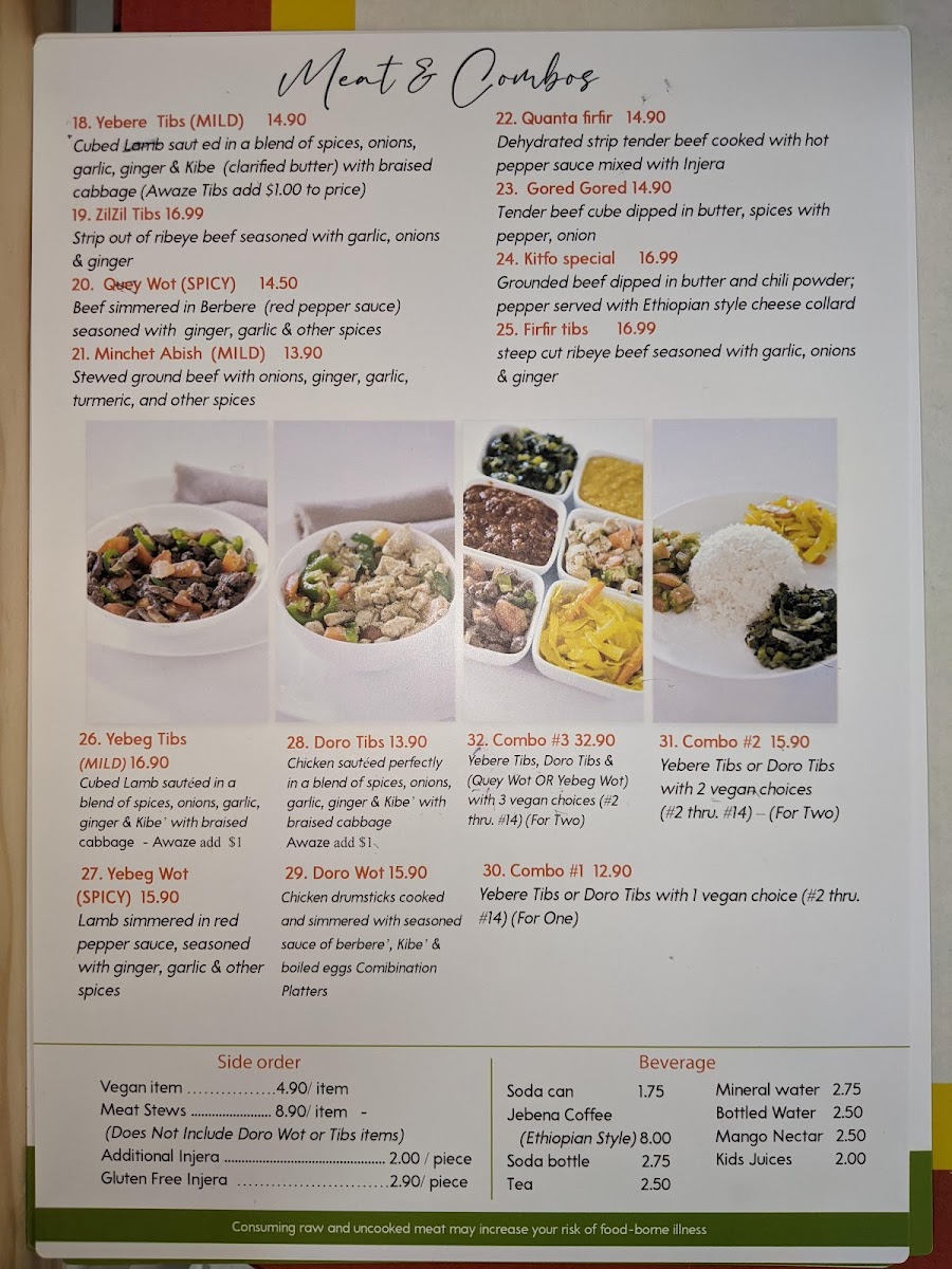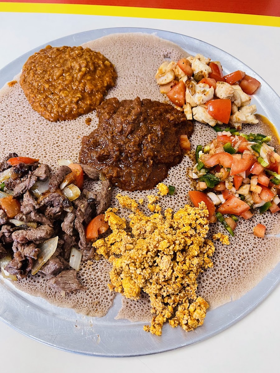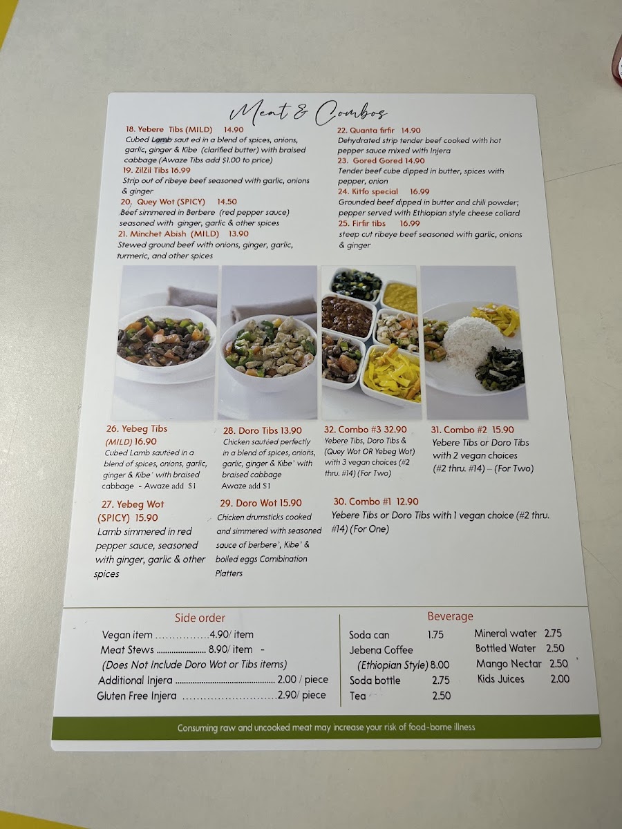 Begin your journey with an appetizer like the Vegan Sambusa, delightful pastry pockets filled with a fragrant mixture of lentils, green peppers, and spices, all for just $3.50. Don't miss out on the signature Yebere Tibs, tender cubed beef sautéed in a divine blend of spices, onions, and garlic, available for $14.00. For those feeling adventurous, the Meat Combo platters, including the mouthwatering Meat Combo 3 featuring both Yebere tibs and Doro tibs, make for a fantastic sharing experience. Priced at $28.50, it’s perfect for two and includes your choice of wot and three vegan items, showcasing the diversity of flavors that Ethiopian cuisine has to offer.