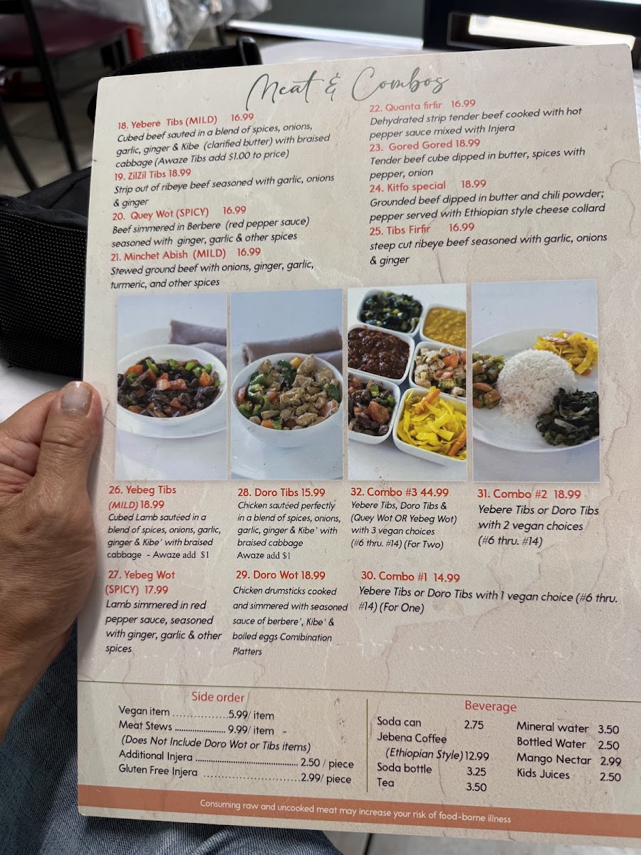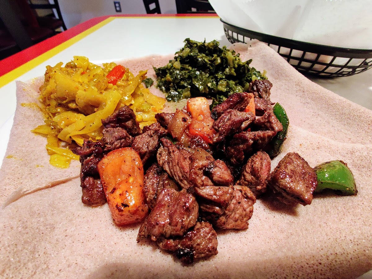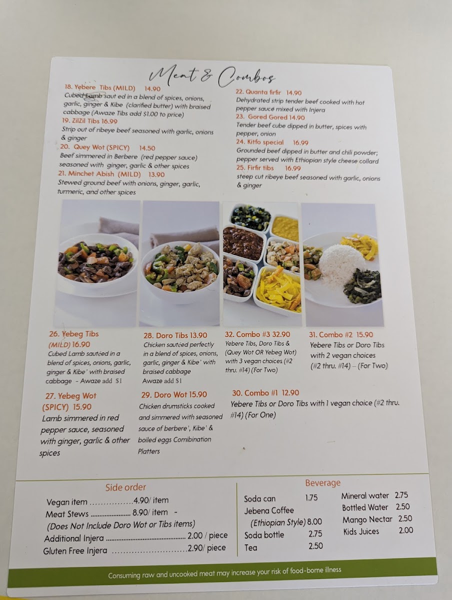Begin your journey with an appetizer like the Vegan Sambusa, delightful pastry pockets filled with a fragrant mixture of lentils, green peppers, and spices, all for just $3.50. Don't miss out on the signature Yebere Tibs, tender cubed beef sautéed in a divine blend of spices, onions, and garlic, available for $14.00. For those feeling adventurous, the Meat Combo platters, including the mouthwatering Meat Combo 3 featuring both Yebere tibs and Doro tibs, make for a fantastic sharing experience. Priced at $28.50, it’s perfect for two and includes your choice of wot and three vegan items, showcasing the diversity of flavors that Ethiopian cuisine has to offer.